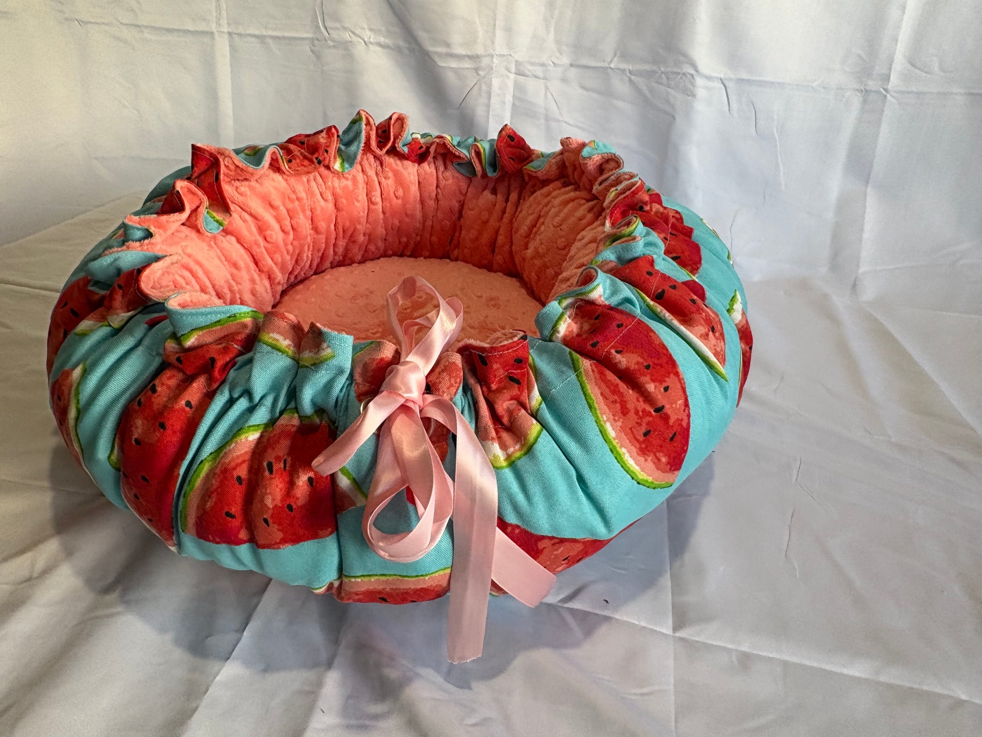 Lit rond qui est ajustable pour nos petites boules de poils. Peut s’ajuster de différentes façons, selon ce qu’on veut lui donner comme grandeur.