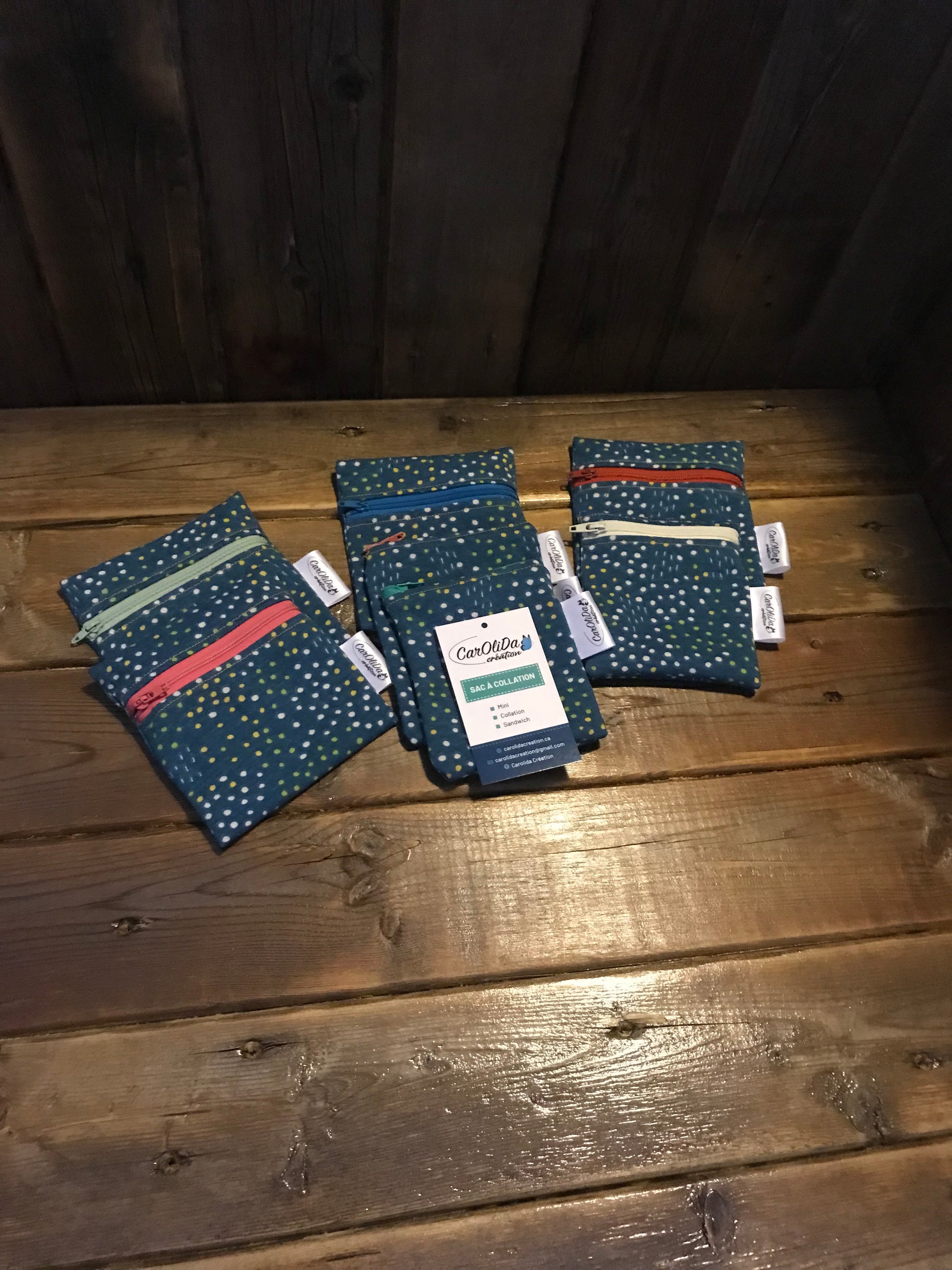 Les sacs sont fait de Polyuréthane Laminé (PUL)/ coton avec une fermeture éclair.